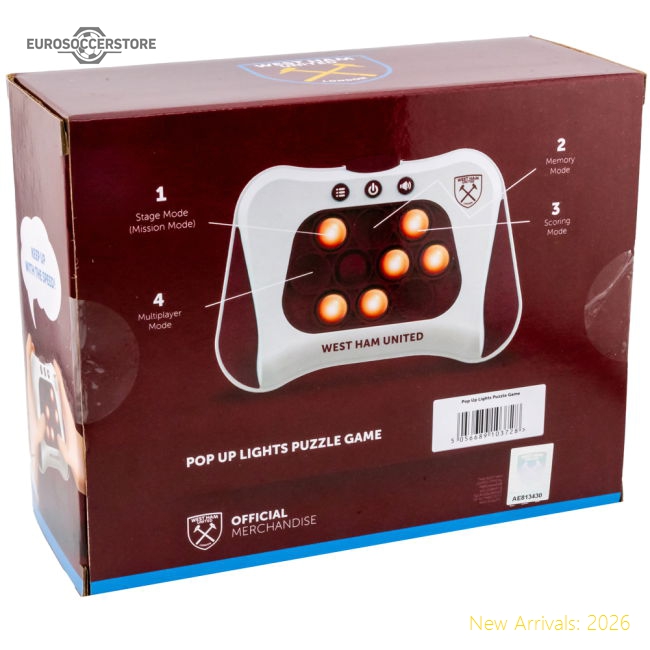 Hand held quick push children's sensory fidget gameWhite game pad, featuring the West Ham claret detail and crestStage Mode, Memory Mode, Scoring Mode and Multiplayer Mode3 x AAA Batteries required (not included)Official licensed productSize: Approx. 13.5cm x 5cm x 10cmPackaging: In a display box Crafted with advanced textile technology for optimal performance and all-day comfort.
